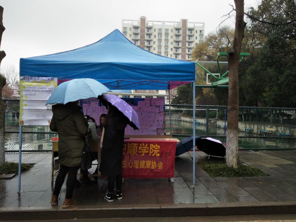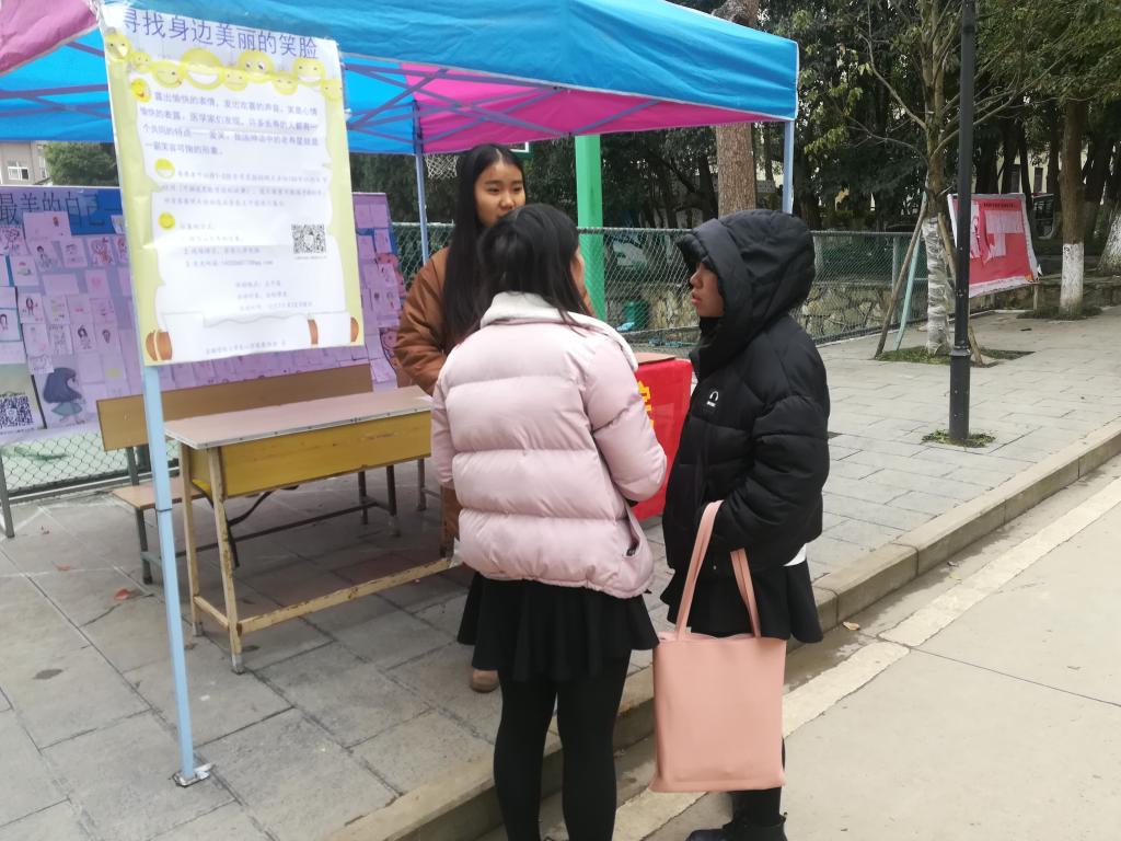 12月7日起,为了迎接大学生心理健康协会一年一度的“12.5活动”的到来,充分展现大学生心理健康时尚的风采,倡导大学生用微笑面对生活,面对人生的态度。大学生心理健康协会在学校主干道发起了“美丽中国,美丽脸庞--笑脸征集活动”。